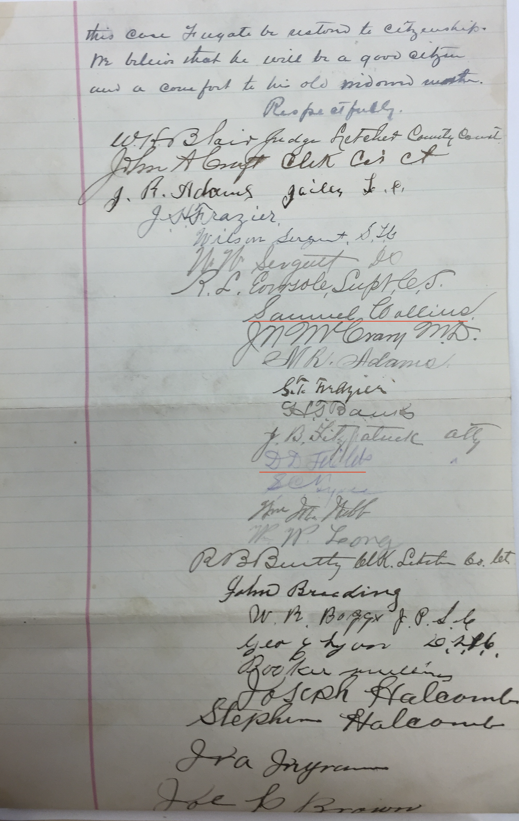 John Langley said, “Shall he send this wire to you or to himself?” Haynes said, “let him send it to you and you bring it up here to yourself.” John immediately sent Collins an elaborate wire telling him of the arrangement and of Col. Haynes; suggestion that he, (Samuel Collins) send the wire direct to John and he would bring it up to him. John got the wire from Samuel Collins next morning, embodying what Col. Haynes had suggested that he say to him. John took Samuels Collins’ wire to Col. Haynes, who called in his assistant, Mr. Jones, and told him to make out the order for the appointment of Bethurum.
