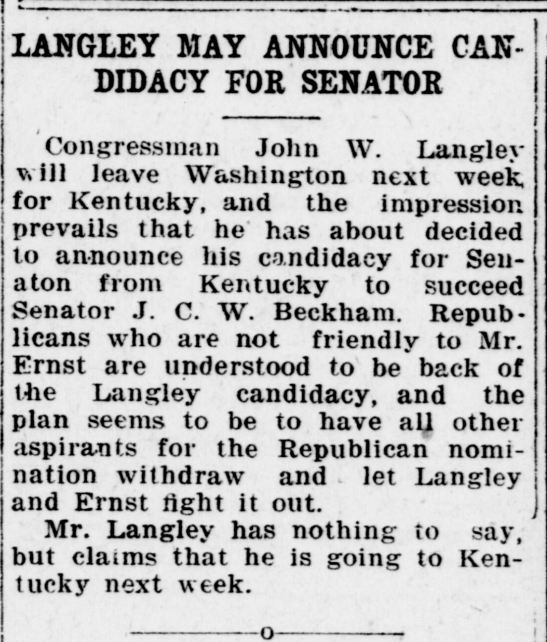 The rumors of John W. Langley’s possible bid for U.S. Senate were causing some major concerns on two political fronts. Sitting, Democrat Augustus Owsley Stanley, an anti-prohibitionist and Progressive Conservative, an attorney from Fleming County who served on the Committee on Mines and Mining, that had jurisdiction over the Bureau of Mines and Geological Survey, a very powerful U.S. Senator that could influence the everyday operations of the Coal Corporations Industry in Kentucky. His term started as U.S. Senator on March 4, 1919, and ended December 3, 1923. He was defeated by Fredrick Mosley Sackett a Republican.