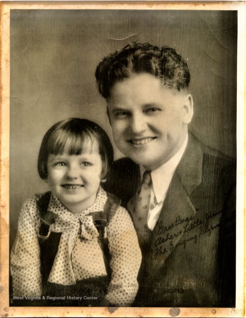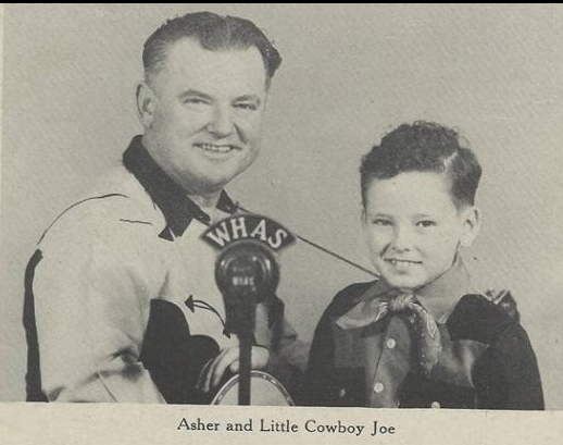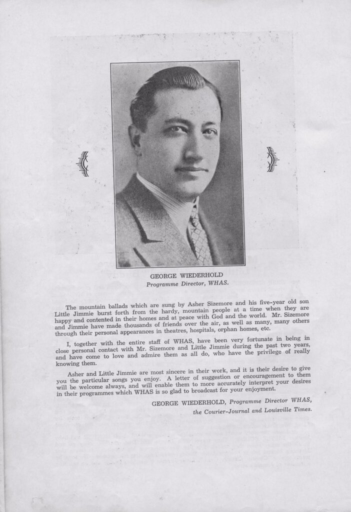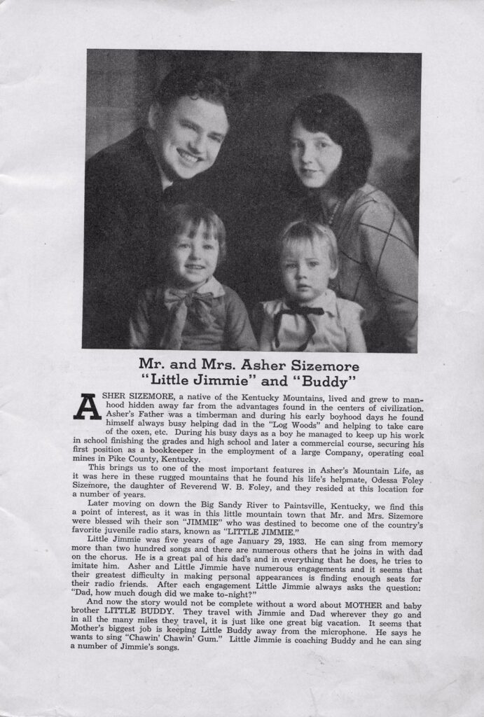 During the long nights of the Great Depression, the only entertainment was often a battery-powered Atwater-Kent or similar radio.  When dusk came and such major stations as WHAS Louisville boosted their power, families would often tune in to live studio music.  One of the top attractions was the father-and-son team of Asher Sizemore and Jimmie.  Reading the introduction on page 2 of the booklet below, we find that Asher was “discovered” as a singer while working for a Pike County coal company.  Included are a few of the songs the pair would have presented to their listeners.  Also included are a short biography of Little Jimmie and photos of his headstone and he and his father in the WHAS studio.