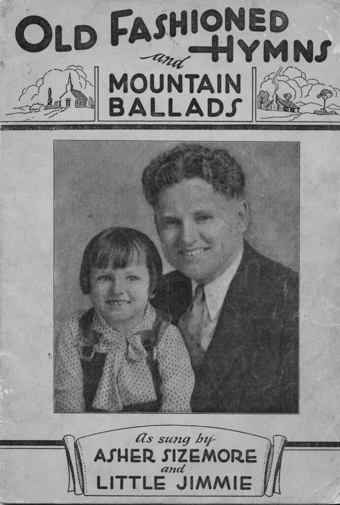 In the April 1994 issue (No. 20) of The Journal, Charles K. Wolfe touched on the life of Asher Sizemore and Little Jimmie by writing of a pamphlet he had and the importance of its use by Asher in a historical context. For our research, it was a bit more tangential of running across his name in promotional ads for others, recalling those “pamphlets” in our collection as well as a friend helping out finding information from sources not available to us. (The Journal No. 20)