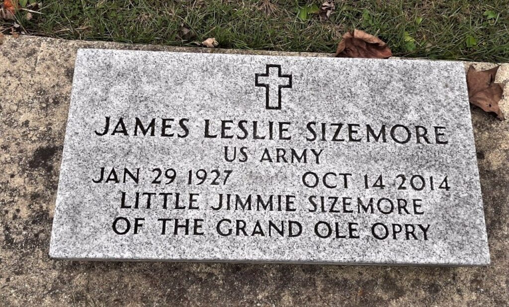 At the age of five, he began singing county music on the radio with his father.  In 1933, the duo was hired by the Grand Ole Opry in Nashville, Tennessee, and were regulars for about ten years.  He was made the youngest member of the Grand Ole Opry.  His program was syndicated throughout the Midwest through the 1930s and 40s.  During that time, his younger siblings, Buddy, Nancy, and Joe, joined the singing group. Sizemore enlisted in the United States Army and served until his discharge in 1947.  He held other jobs during his adult life, notably with a radio station in Jacksonville, Arkansas and as a home construction contractor in Muskogee, Oklahoma.  However, even into his eighties, Little Jimmie continued to sing, play his guitar, and perform at small venues.