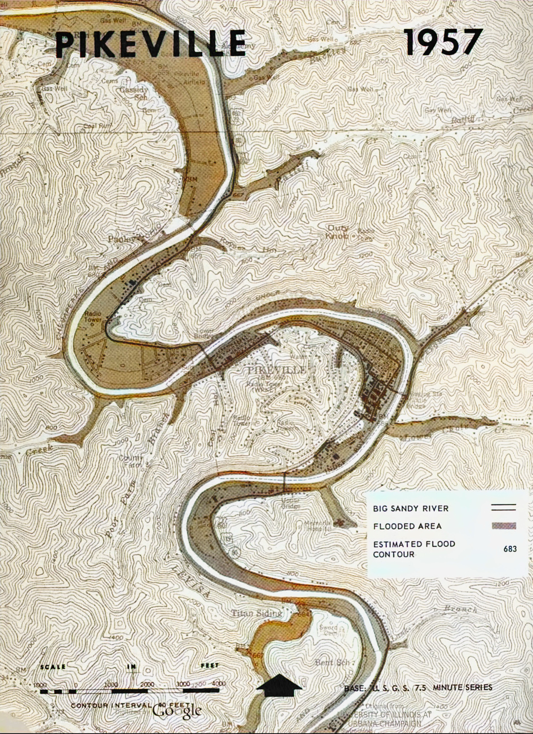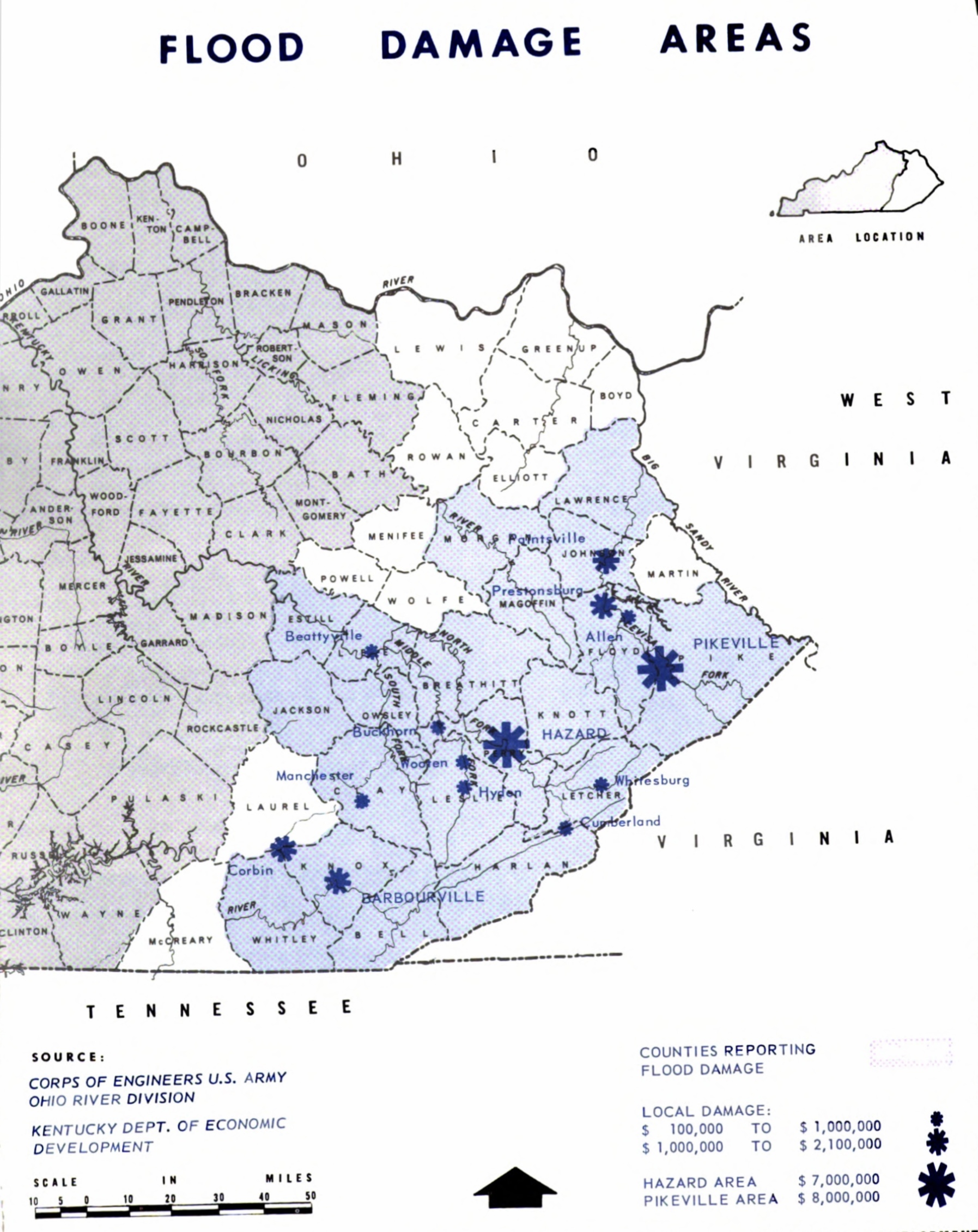 The mid-winter flood of 1957 wrought great destruction in the Big Sandy, the Kentucky, and the Cumberland river valleys. At Pikeville on the Big Sandy River over $8.5 million in damage was recorded. At Hazard on the North Fork of the Kentucky River an estimated $4.5 million worth of damage was done. At Barbourville on the Cumberland River flood damage figures exceeded $1. 3 million. These are only instances. The January flood caused an estimated total of more than $50 million worth of damage in Eastern Kentucky, 80 per cent of the dollar damage in the entire four-state area affected.