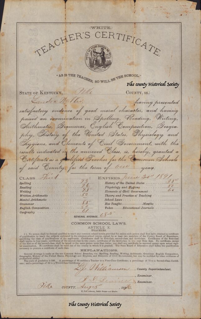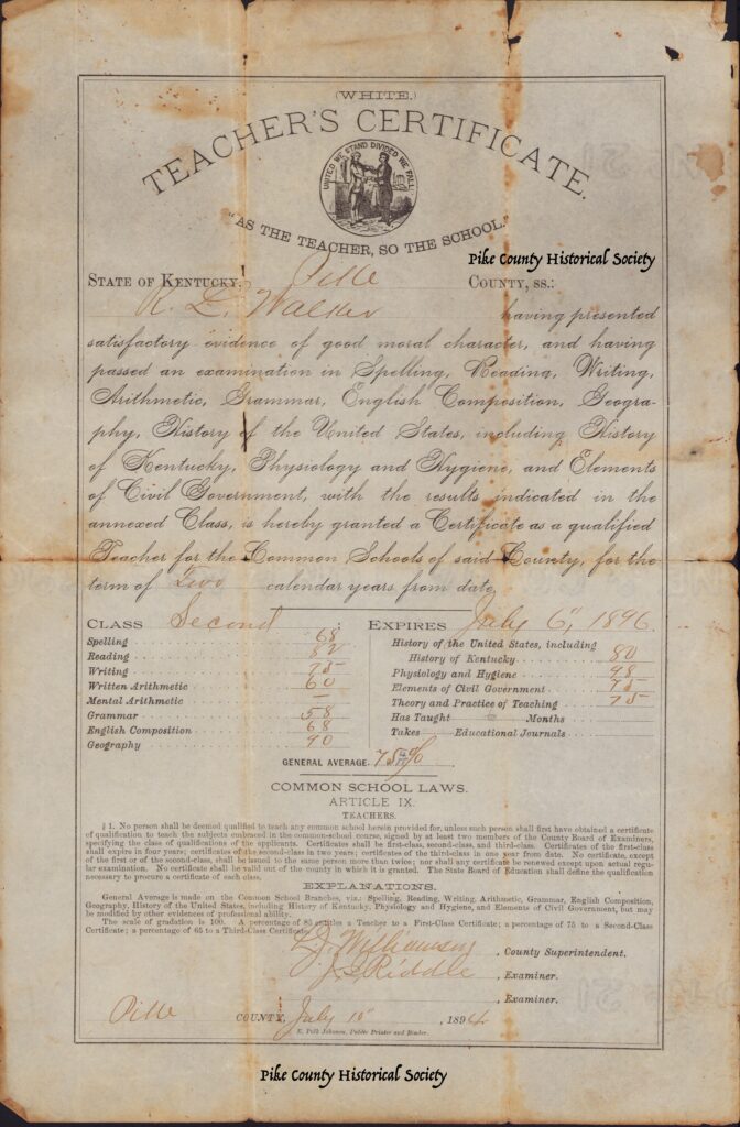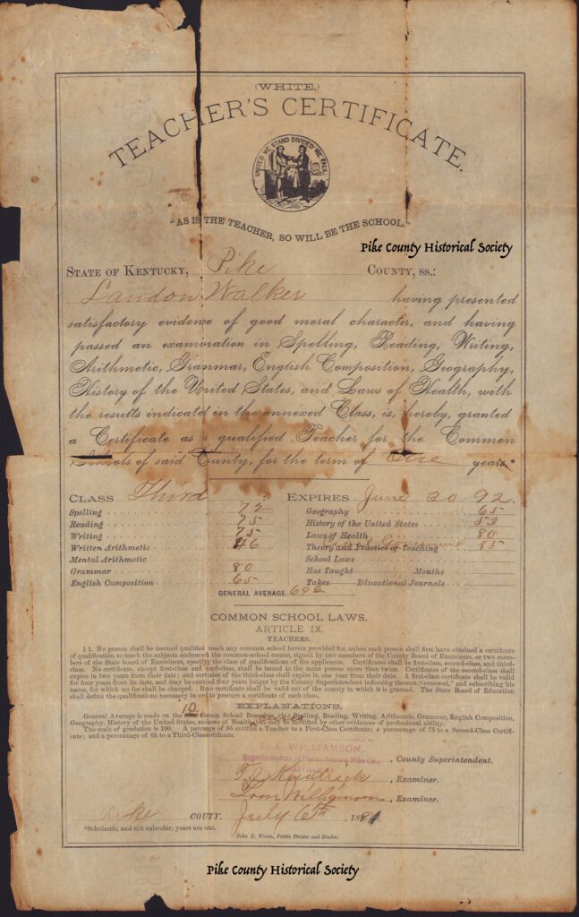 A special thanks to Carolyn Morehead the last surviving daughter Roland Landon Walker for donating the last surviving Pike County Teachers Certificates to the Pike County Historical Society