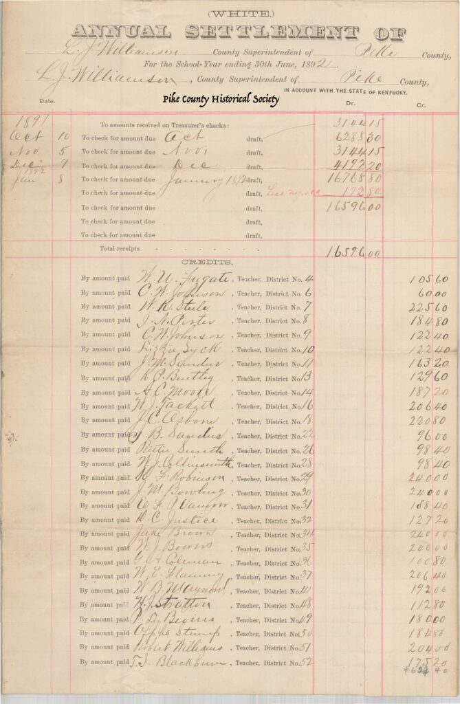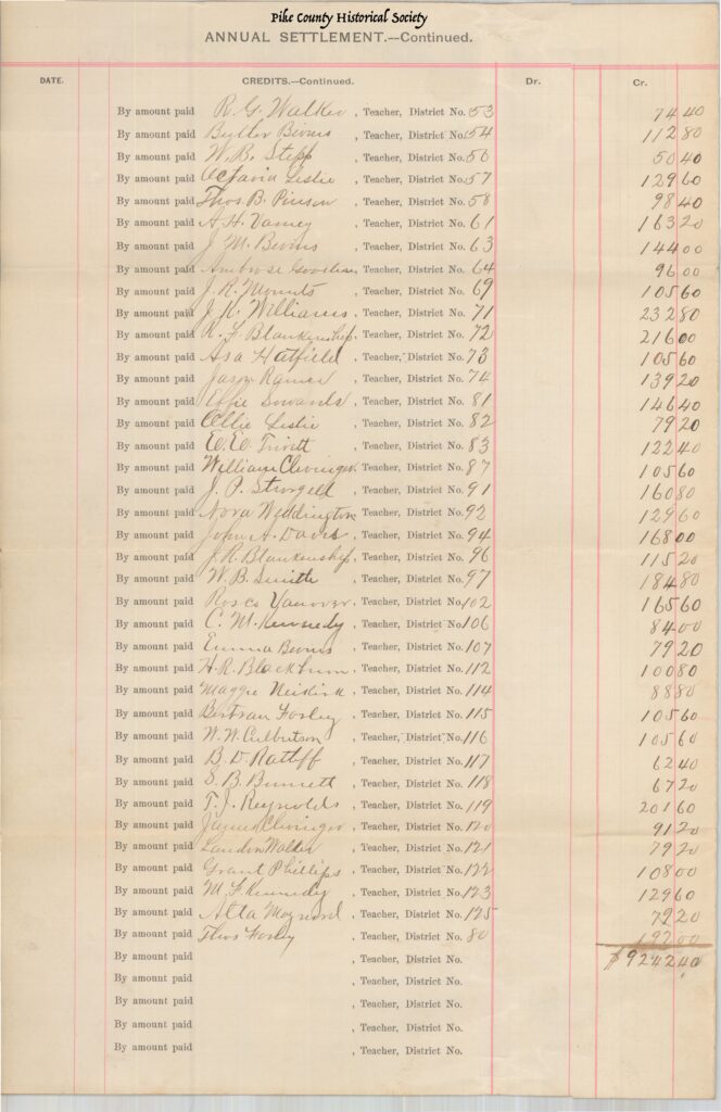 Roland Landon Walker is shown in Pike County’s Annual Teachers Settlement listed in 1892, qualified to teach Third Grade Level in Pike county Schools. School District No. 121.
