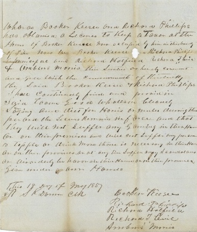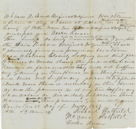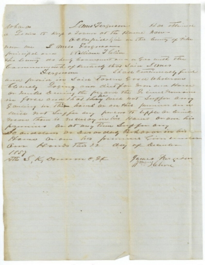 - Nov. 21, 1855 (Loose papers) Whereas James Gerguson has obtained a license to keep a tavern at his house residents in the county of Pike made we James Ferguson principal and Colbert Cecil his security do hereby covenant and agree with the Commonwealth of Kentucky that the said James Ferguson shall continually find and provide in said times good wholesome cleanly lodging and diets for travelers and stabling and provender as pasturage for horses or mules during the period the license remains in force and that he will not suffer any gaming in his house or on is premises and will not suffer any person to tipple as drink more that is necessary in his house or under his house or on his premises or at any time suffer any scandals or disorderly behavior in his house or on his premises given under our hands this 21st day of November 1855.
