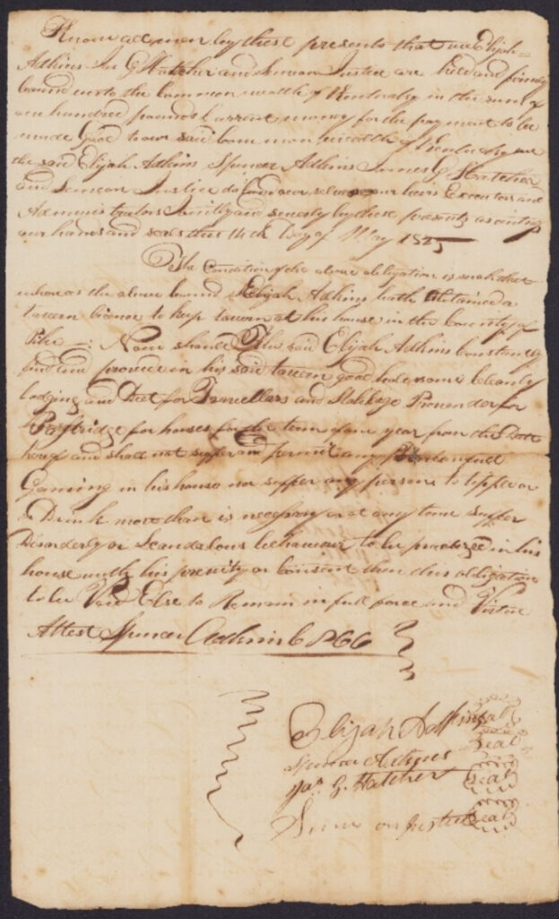 - A-339 – Nov. Term 1830 – Ordered that the tavern rites as last said as to dieting, lodging, retailing liquors, horse feed, and stablage be continued as last.