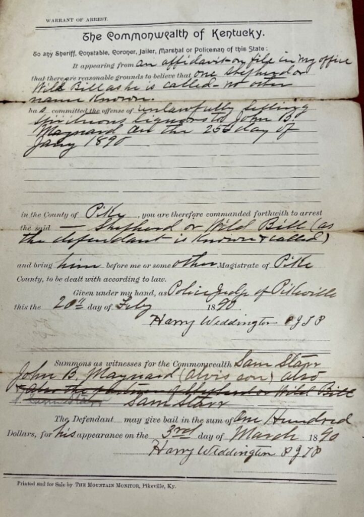 There were arrests made in Pike County over the years for selling or even partaking one to many sips of the cider requiring arrests to be made. One such arrest is Wild Bill as he was known. We get a hint at the last name as Shepherd. He is arrested for “unlawfully selling spiritous liquors to John B. Maynard on the 25th day of January 1890”, having the following warrant sworn out for his arrest on March 3, 1890. A few others arrested in Pike County ensued. Floyd McCoy is arrested for retailing spiritous liquors in the Sept. 1875 Pike term of court. On January 12, 1888, the Pike Court held its arraignments observed in The Big Sandy press, reporting 183 indictments, a large number of them for selling liquor. That same year in May 1888, Marshall Davis and Jailer Cline, decided it was best to arrest the men who are selling liquor in their county. They had discovered a total of eight men in a warehouse. Cline made his way into the building where Preston Fleming was locked and loaded, pointing his gun. Marshall Davis saved the life of Cline by shooting Fleming dead. He fell right there in the doorway, and the other seven men were arrested. Marshall Davis left the county in fear of more trouble.