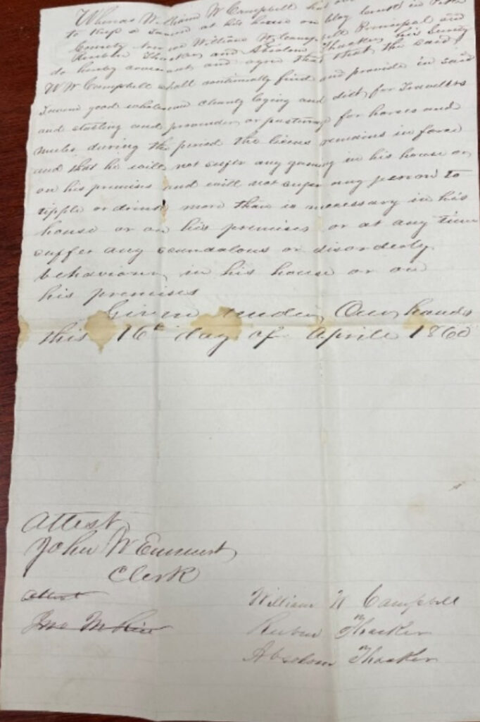 - April 15, 1861 – (Loose papers) Whereas Wm. M. Campbell has obtained a license to keep a tavern as his house on Clay Creek in Pike County. Now we Wm. M. Campbell principal and John Raines, and William Ford as his surety do hereby covenant and agree that the said Wm. M. Campbell shall continually find and provide in said tavern good wholesome cleanly lodging and diet for travelers and stabling and pasturage for horses or mules during the period the license recorded in form and that he will not suffer any gaming in his house or on his premises and will not suffer any person to tipple or drink more than is necessary in his house or on his premises or at any time suffer any scandalous or disorderly conduct in his house or on his premises given under our hands this 15th April 1861. William Campbell, John Rains, Wm Ford.