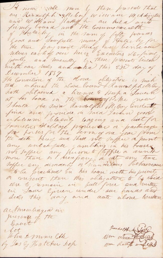 - (1856) Whereas James Ferguson has obtained a license to keep a tavern at the house now occupied by him in this county of Pike now we James Ferguson, Principal, and Colbert Cecil his security do hereby covenant and agree with the Commonwealth of Kentucky that said James Ferguson shall continually find and provide in said tavern good wholesome cleanly lodging and diet for travelers and stabling and provider – or pasturage for horses and mules during the period the license remains in force and that he will not suffer any gaming in this house or on his premises and will not suffer any person to tipple or drink more than is necessary in his house or on his premises or at any time suffer any scandalous or disorderly behavior in his house or on his premises given under our hands this 15th day of December 1856. Att. S.K. Damron Clk. James Ferguson, Colbert Cecil.