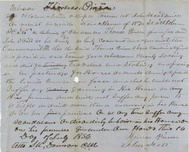 Thomas Stovall Pinson received a tavern license on July 16th, 1856, to be run from the mill of John Scott or the store or house of William M. Scott, the place was evidently not yet secured. His surety was John Scott.