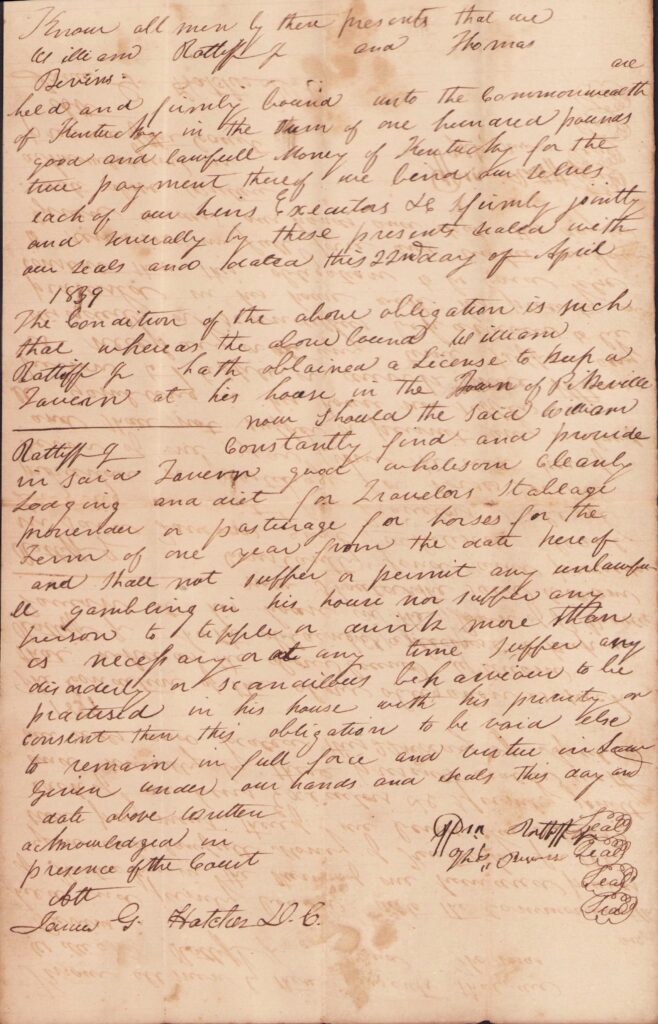 - Sept. 1837 – B-282 – On motion of Richard Ratliff tavern license is granted for one year from this date fee of tax and he thereupon together with Henry C. Harris and John D Mims ahis securities entre into an acknowledged their bond to the Commonwealth of Kentucky in the sum of L100 conditioned according to law and took the oath prescribed by law.