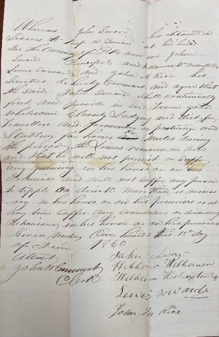 - June 1860 – C1-369 – Upon motion of John Sword a license tavern keeper of this county his having made the necessary proof he is permitted to renew his tavern bond for the term of twelve months. His sureties are Hibbard Williamson, William Weddington and Lewis Soword.