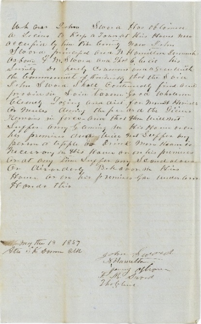 - (1857) Whereas John Sword has obtained a license to keep a tavern at his house now occupied by him, Pike County, now John Sword principal and N. Hamilton, Jeremiah Osborn, F.M. Sword and Thos. C. Cecil his security do hereby covenant and agree with the Commonwealth of Kentucky that the said John Sword shall continually find and provide in said tavern good wholesome cleanly lodging and diet for man and horse and mules during the period the license remain in force and that he will not suffer any gaming in his house or on his premises and will not suffer any person to tipple or drink more than is necessary in his house on or in his premises or at any time suffer any scandalous or disorderly behavior in his house or on his premises given under our hands this May the 18th, 1857. Atto. S.K. Damron Clk. John Sword, N. Hamilton, Jeremy Osborn, F.M. Sword, Thos. C. Cline