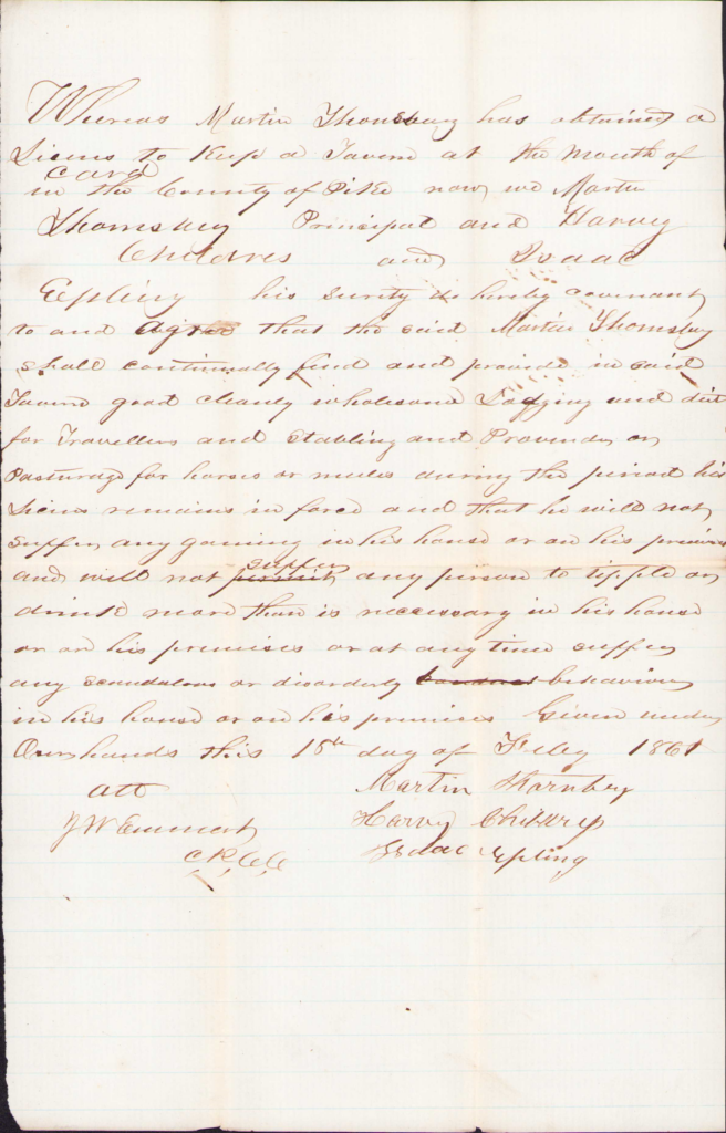 - Feb 15, 1861 – C1-313 – For tavern license to retail spirituous liquors this day the plaintiff filed his motion. The Loose Papers is the bond; Whereas Martin Thornsbury has obtaining a license to keep a tavern at the mouth of Card in the county of Pike now we Martin Thornsbury principal and Harvey Childers and Isaac Epling his surety do herby covenant to and agree that the said Martin Thornsbury shall continually find and provide in said Tavern good cleanly wholesome lodging and diet for travelers and stabling and provender or pasturage for horses or mules and that he will not suffer any gaming in his house or on his premises and will not suffer any person to tipple….15th day of February 1861.