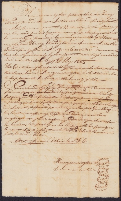 - Know we all men by these presents that we Henry Weddington and Simeon Justice are firmly bound unto the Commonwealth of Kentucky in the sum of one hundred pounds current money for the payment to be made good to our said Commonwealth of Kentucky we the said Henry Weddington and Simeon Justice are held and firmly bound jointly our executors and administrators has jointly and securely by these presents as witnesses our hands and seal this 14th day of May 1825.