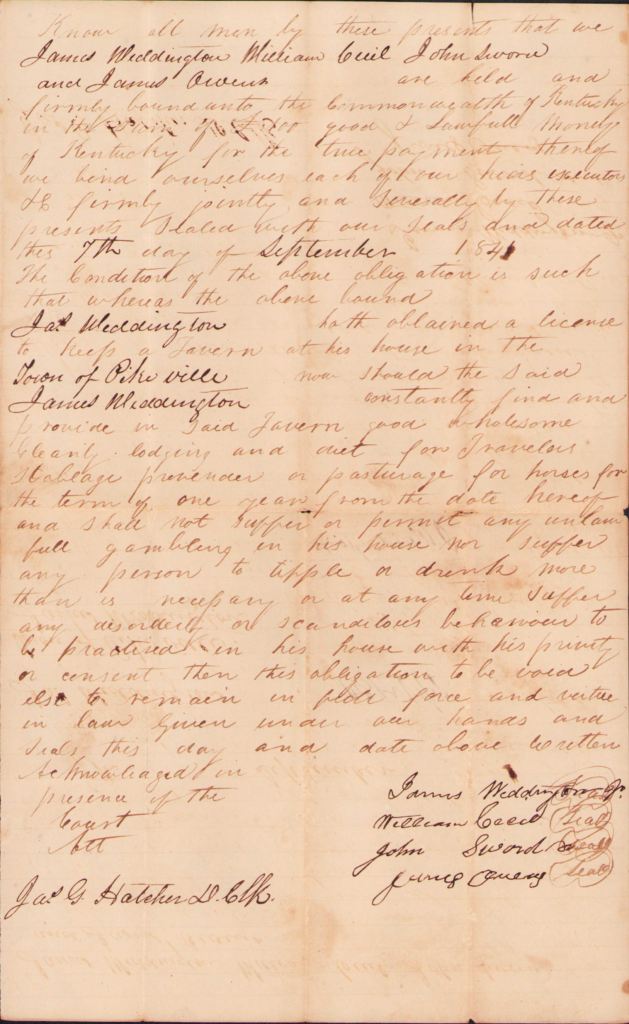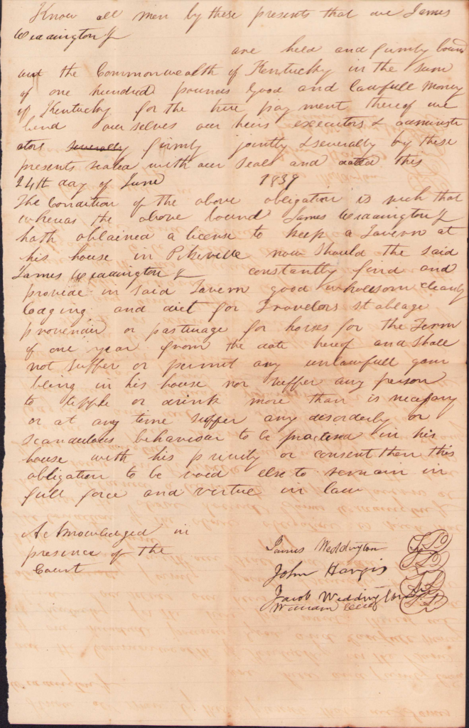 - June 1839 – B-356 – Tavern License – On motion of James Weddington Jr he hath leave to keep a tavern at his house in the town of Pikeville for twelve months from the date hereof who together with John Hargis, Jacob Weddington and Wm. Cecil his securities entered into and acknowledged their bond to the Commonwealth of Kentucky according to law and he thereupon took the lath required by law.