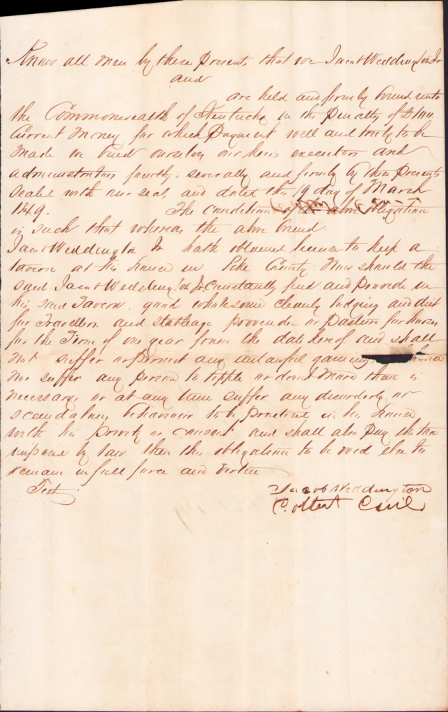 - March 19, 1849 – B1-347 – On motion of Jacob Weddington Jr a tavern license is hereby granted him to keep a tavern at the house now occupied by him in the county for the tern of one year from the date wherefore he took the oath required by law and together with Colbert Cecil his security entered and acknowledged the bond to the Commonwealth of Kentucky to the penalty of one hundred pounds conditioned according to law.