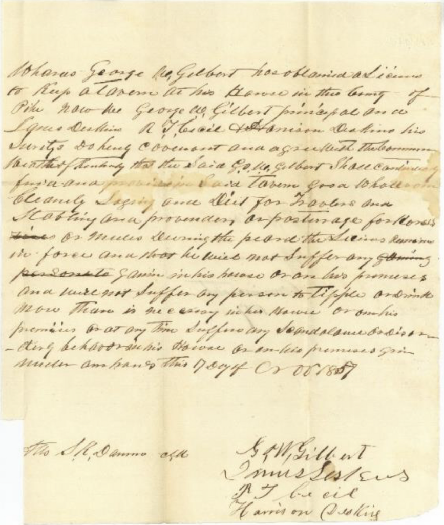 The condition above obligation is such that whereas the above bound Henry Weddington hath obtained a license to keep tavern at his house in the county of Pike. Now should the said Henry Weddington constantly find and provider in his said tavern good wholesome cleanly lodging and diet for travelers and stables provider for pasturage for horses for the term of one year from the said house and shall not suffer and permit any unlawful gaming in his house nor suffer any person to tipple or as drink more than is necessary or at any time suffer disorderly or scandalous behavior to be practices in his house with his premises or construct there this obligation to be void else to remain in full force and virtue. Attest Spencer Adkins C.P.C.C. – Henry Weddington, Simeon Justice.
