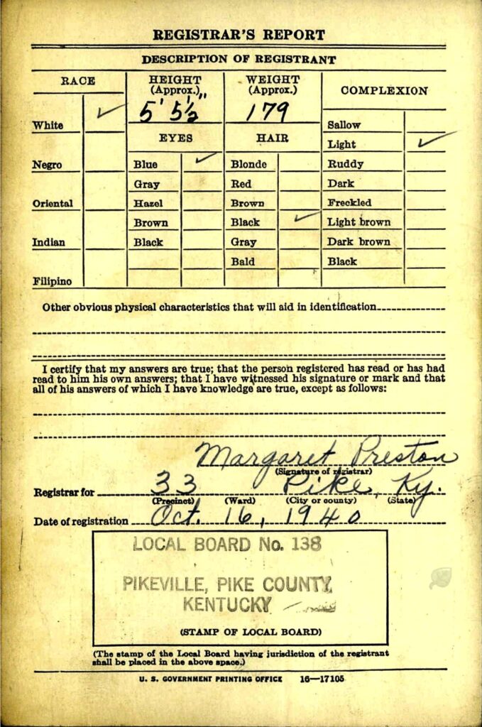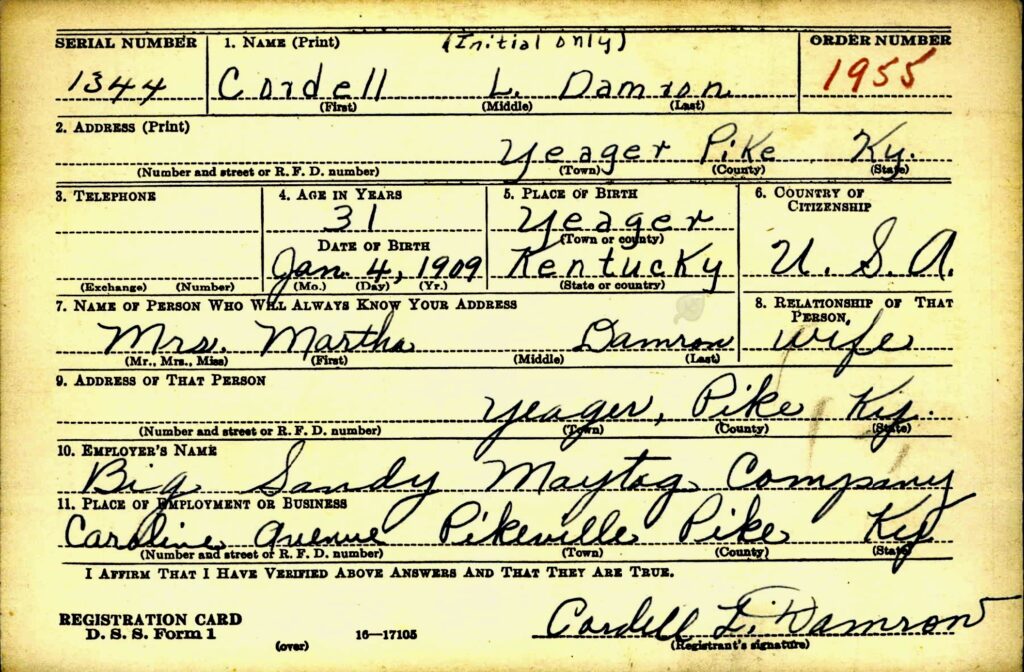 In the 1940 census, his occupation was repairing radios. the threat of War was looming on the horizon, Cordell went to Pikeville to sign up for the draft, image shown below.