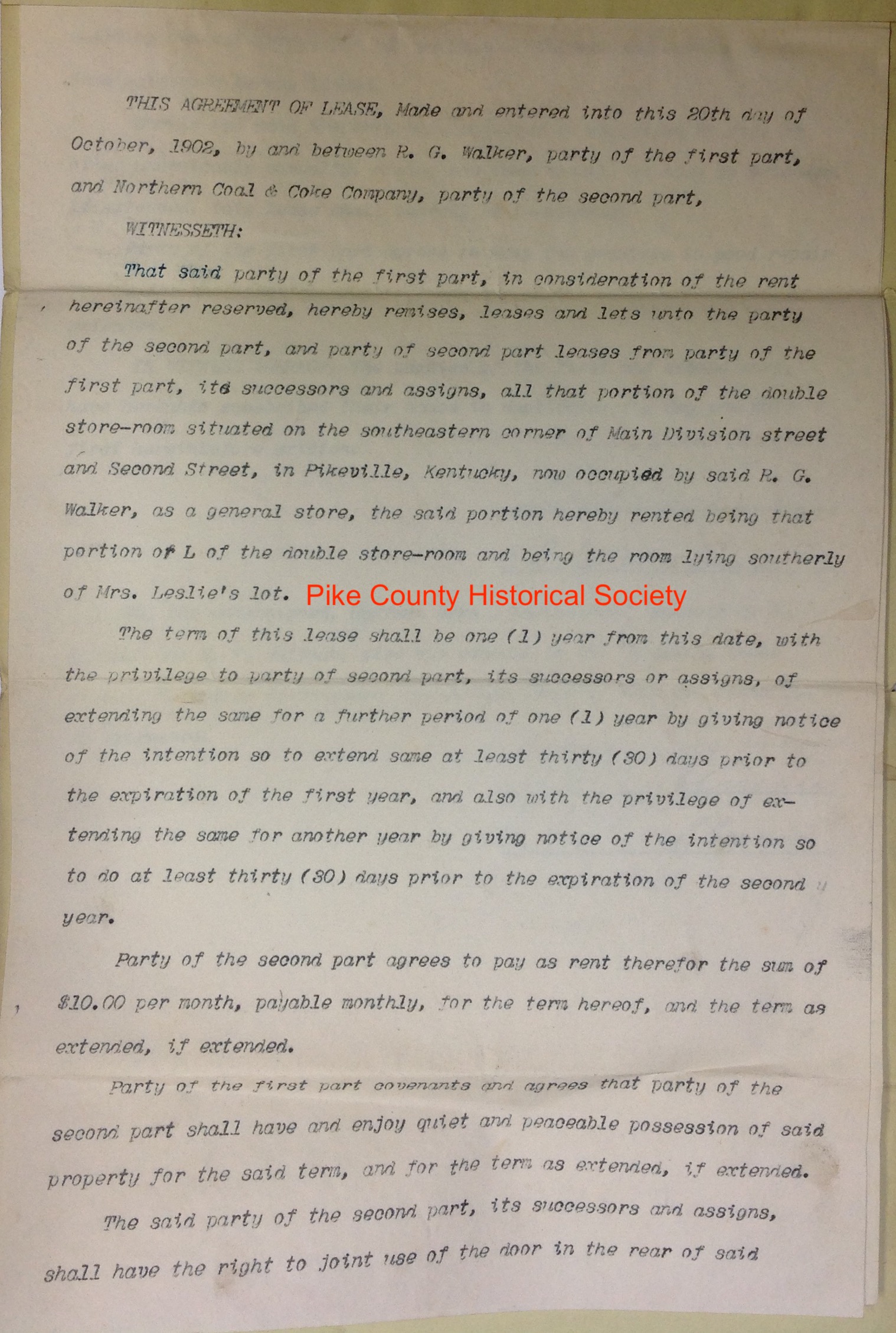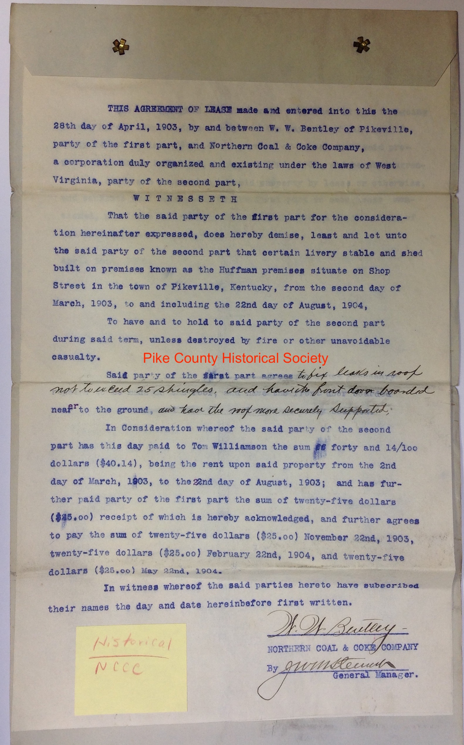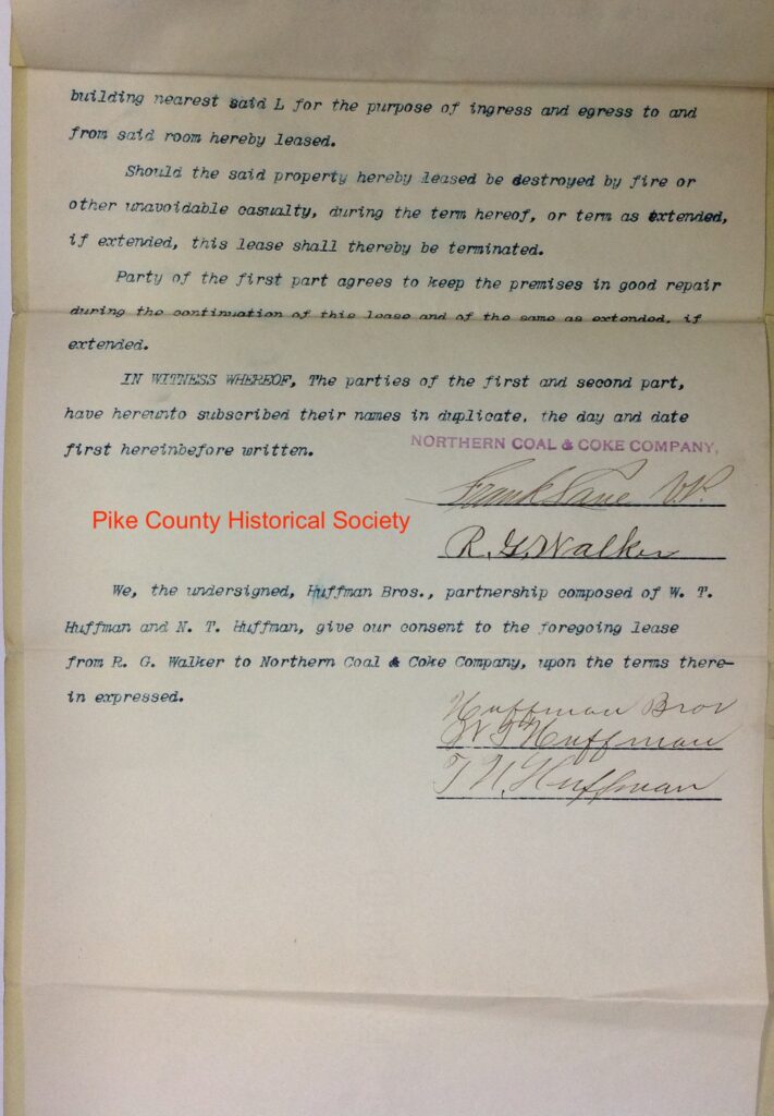 Northern Coal & Coke Company undersigned lease from WT & NT Huffman / Huffman Brothers October 20, 1902, Pikeville Central Office