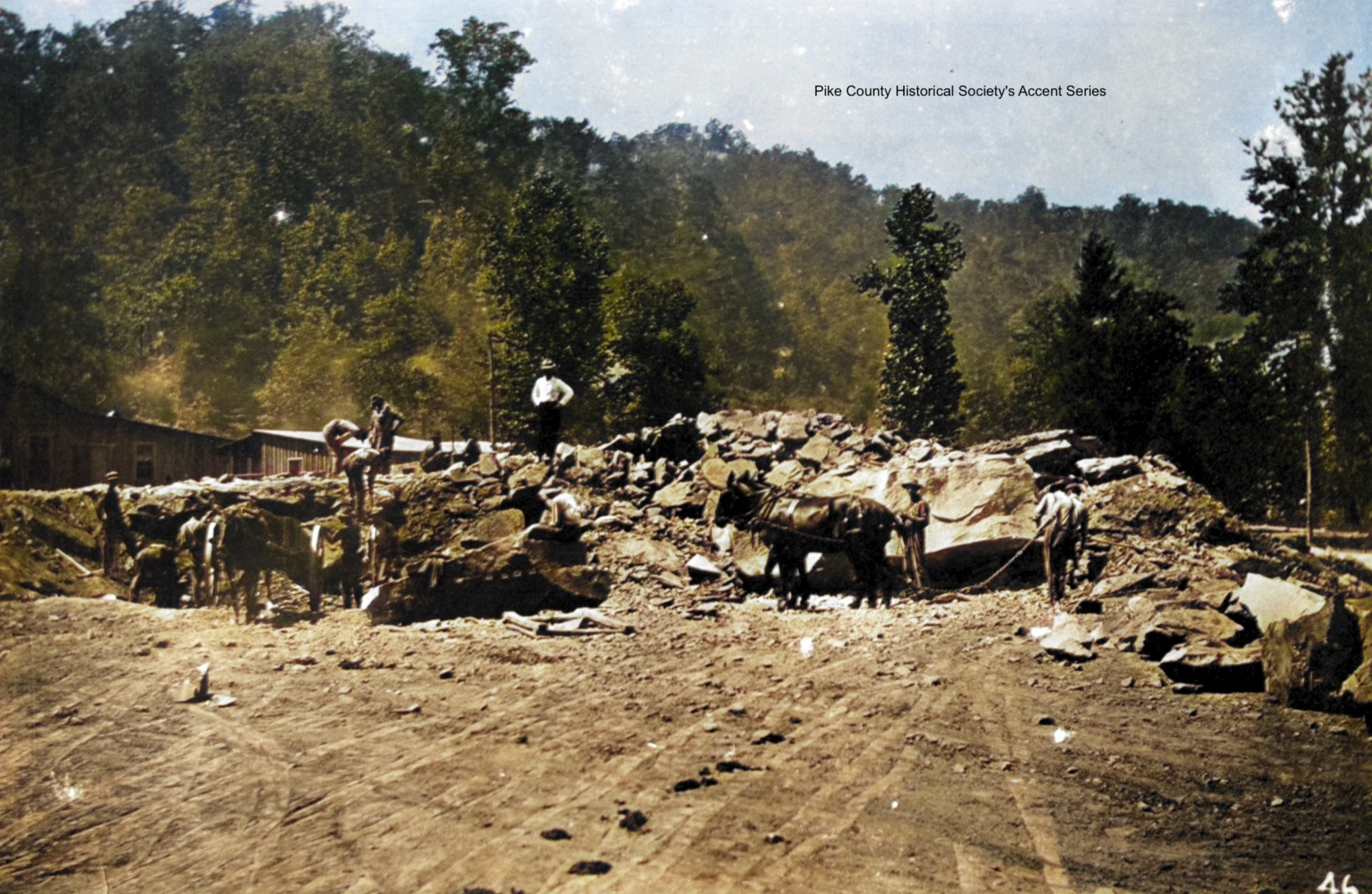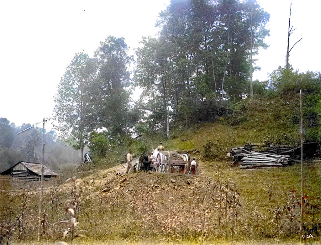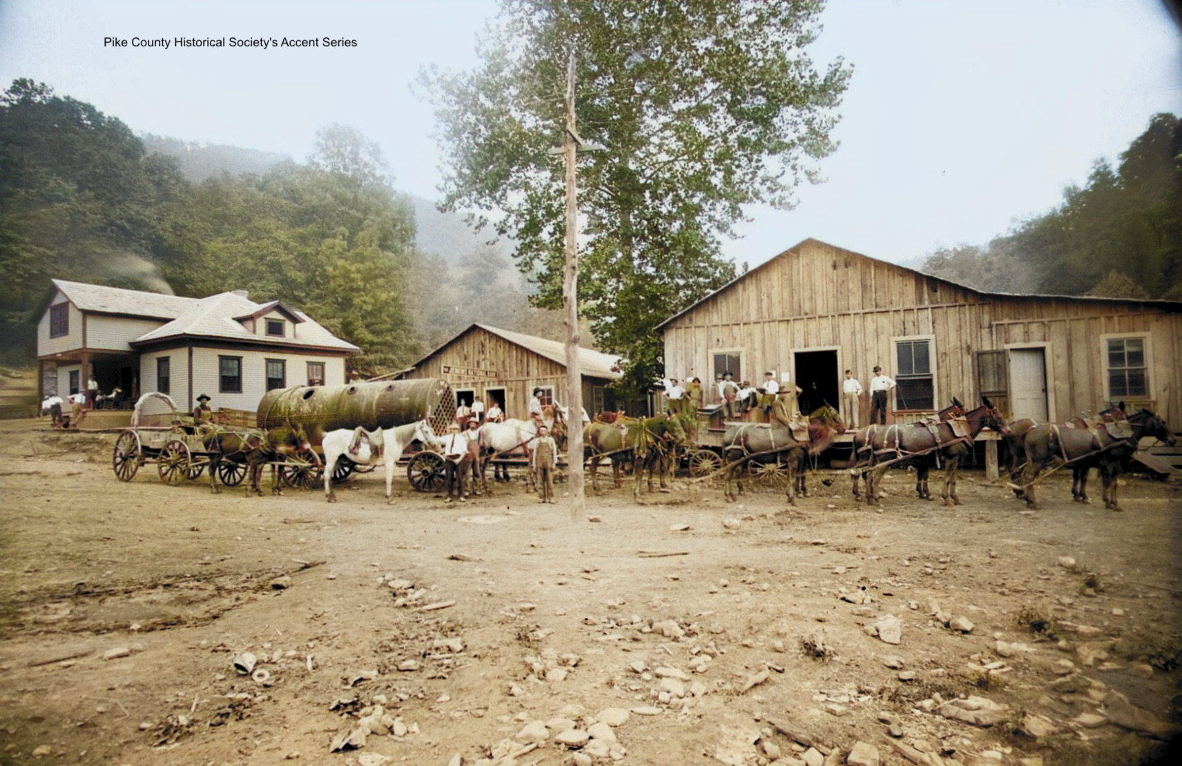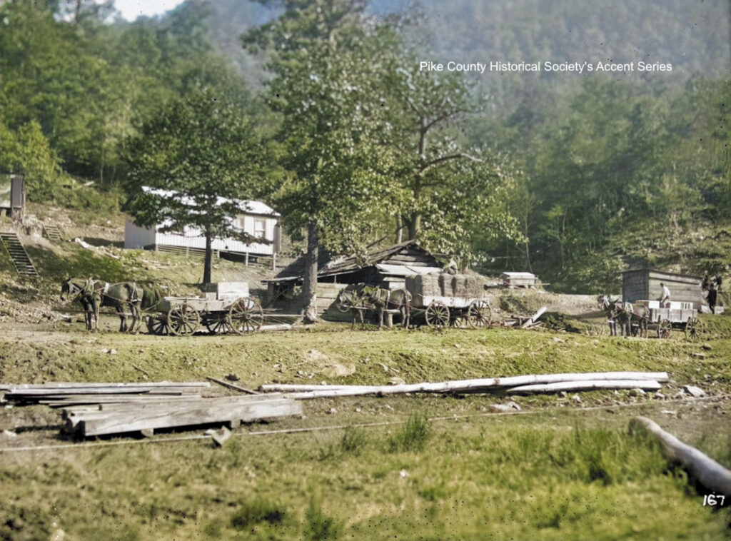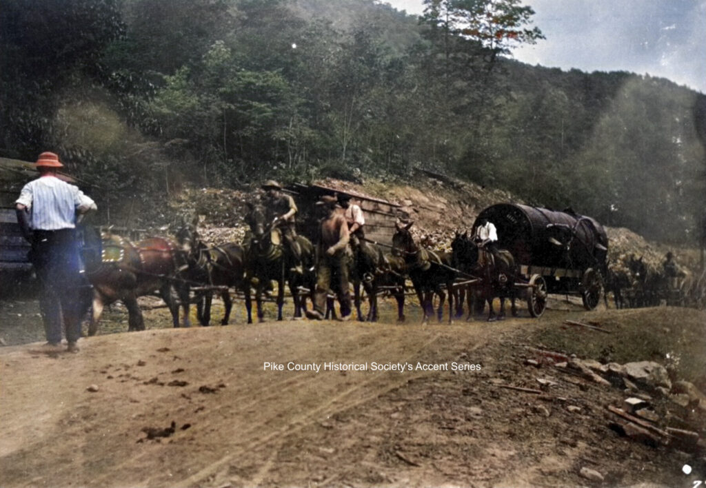 Mule Trains bringing supplies up from Ash Camp. Supplies were transported by rail up to Hellier Depot, the supplies were loaded onto wagons, transport through Gap on the Left Fork of Brushy Branch at Edgewater’s mine, then down to Ash Camp, then up Elkhorn Creek to the future home of Consolidation City.