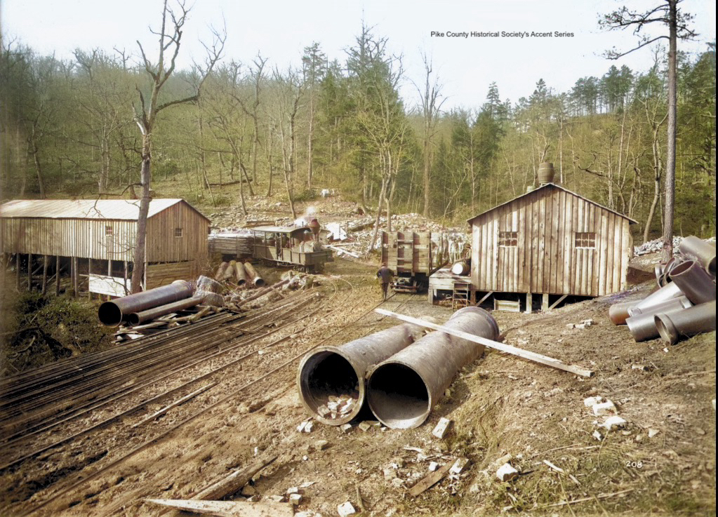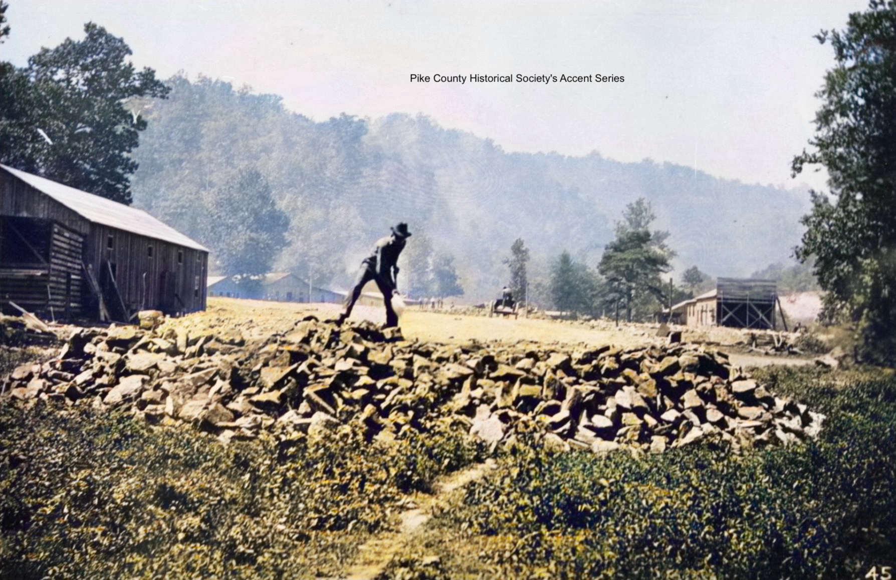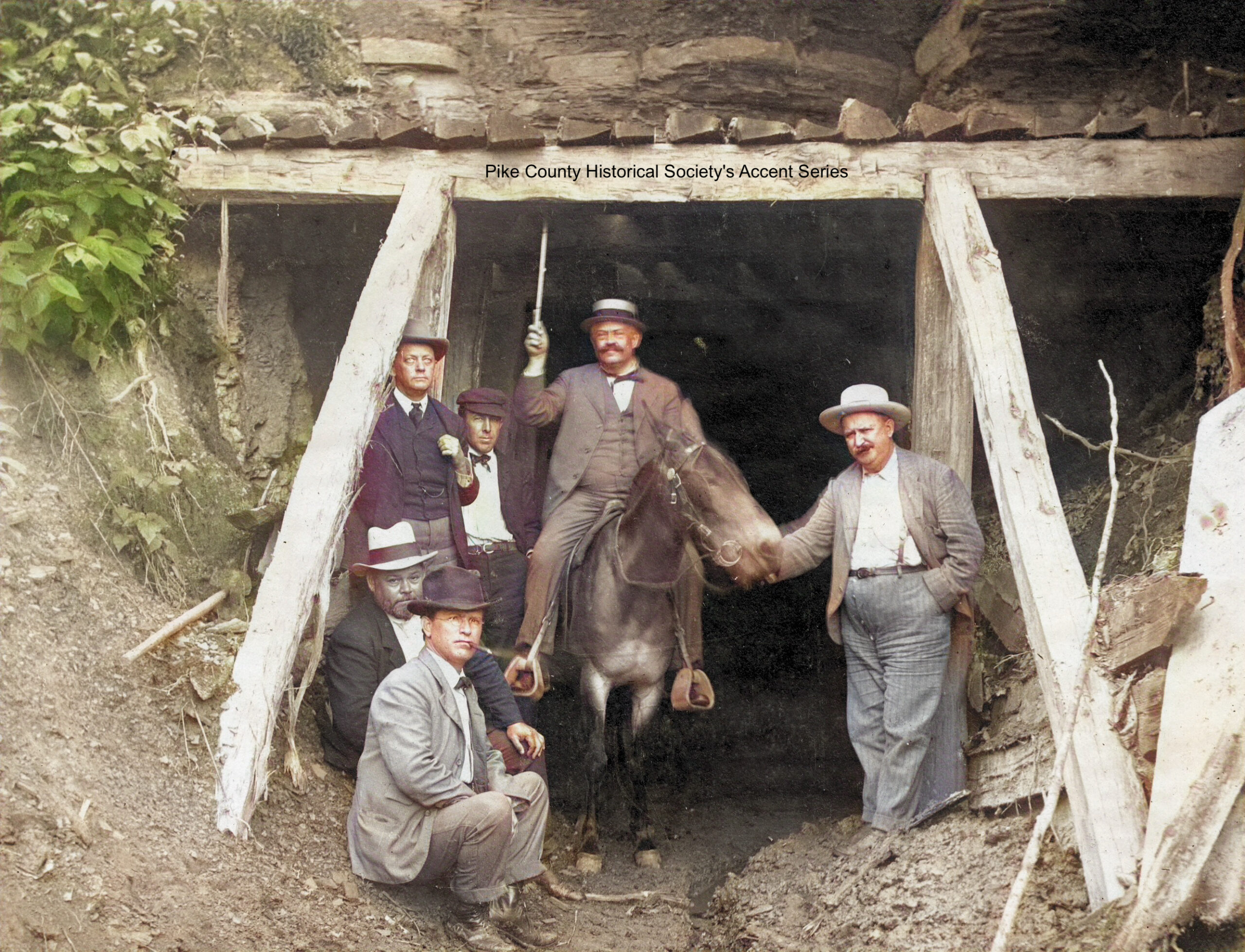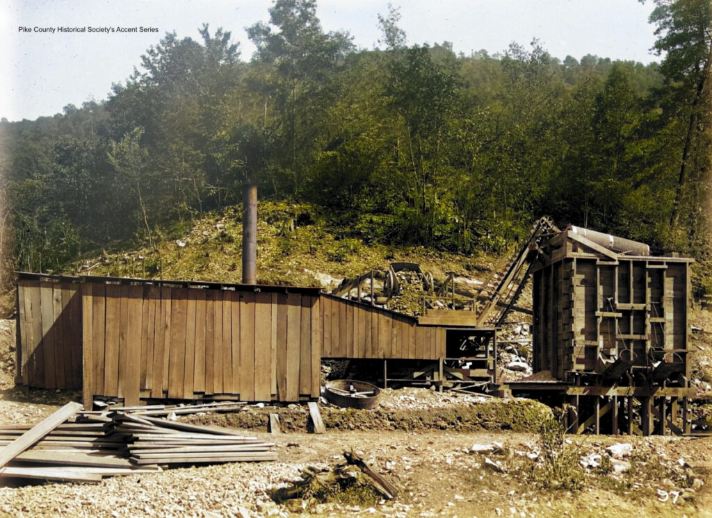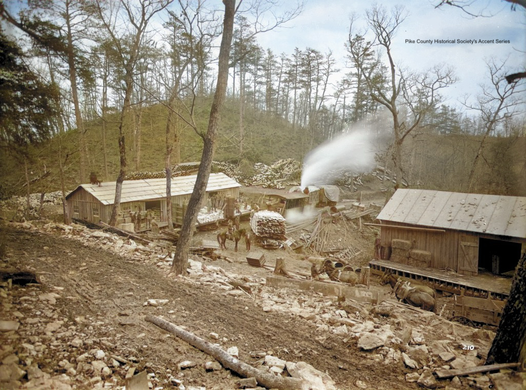 Mule Trains bringing supplies up from Ash Camp. Supplies were transported by rail up to Hellier Depot, the supplies were loaded onto wagons, transport through Gap on the Left Fork of Brushy Branch at Edgewater’s mine, then down to Ash Camp, then up Elkhorn Creek to the future home of Consolidation City.