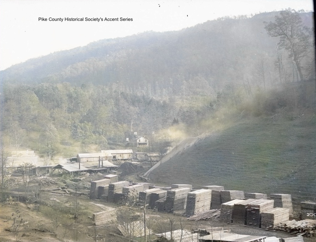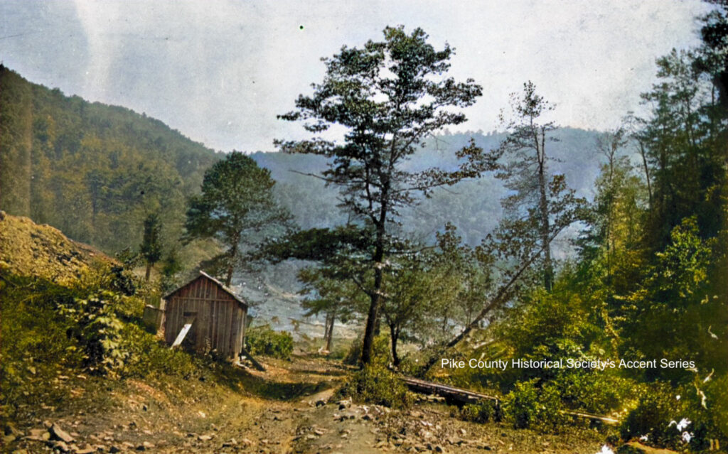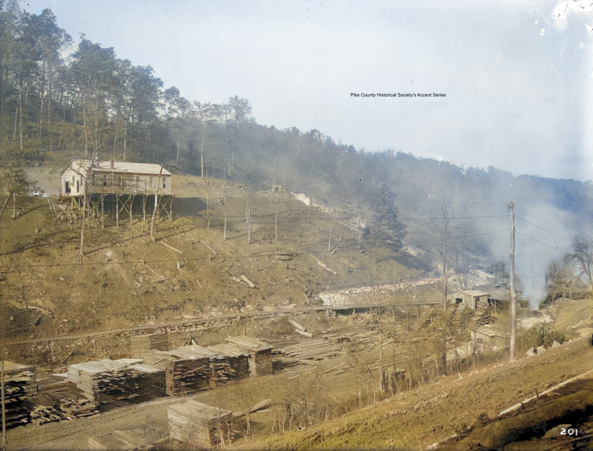 The Newspapers stated when Consolidation Coal Company tore down the Old Cabin of Devil John and Mattie Wright lived in, they moved down to his property next a Hotel on Elkhorn Creek, near John D. Bentley. Seen south of Hotel is a Splash Dam. This is one of two Splash Dams, Devil John and Kinky Haired Samuel Wright used to float timber past Shelby Gap.