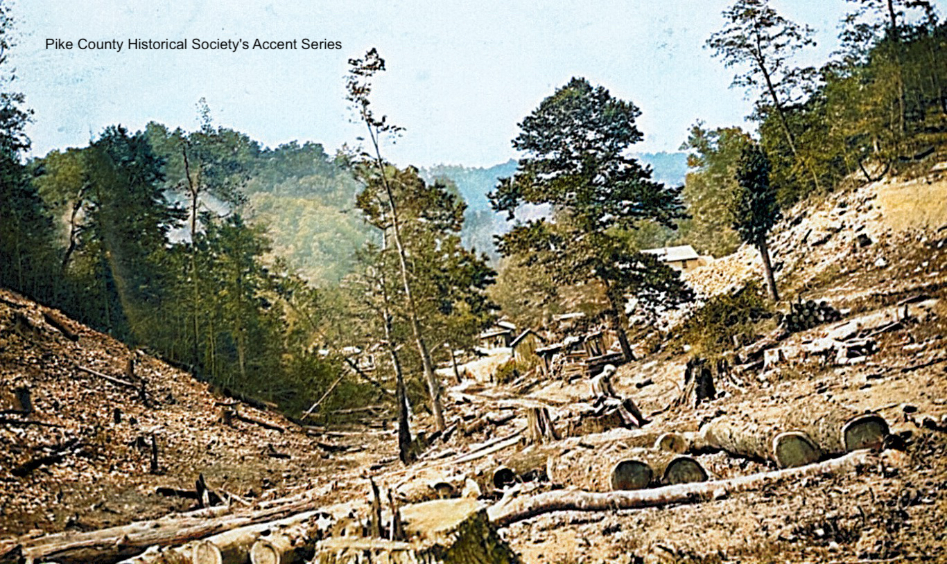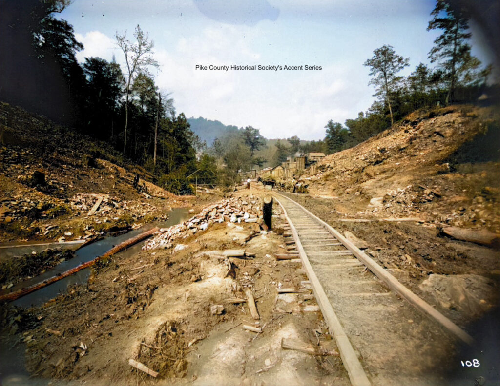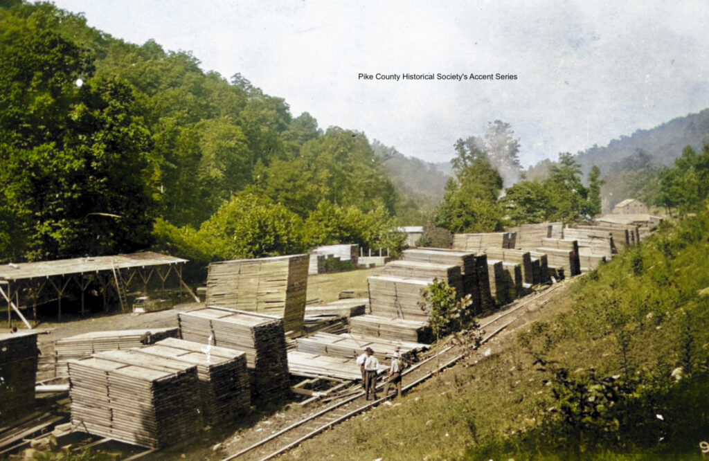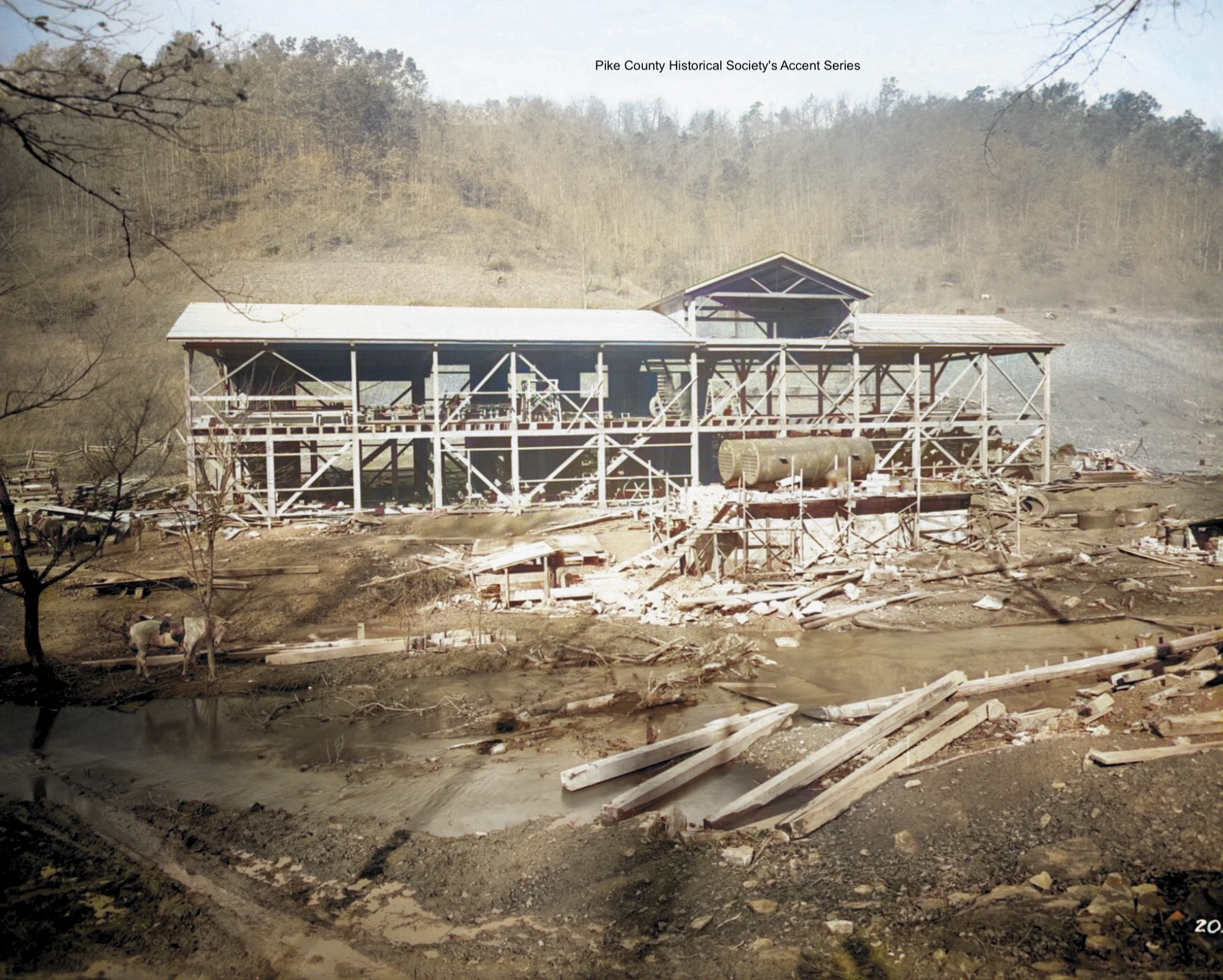 The Newspapers stated when Consolidation Coal Company tore down the Old Cabin of Devil John and Mattie Wright lived in, they moved down to his property next a Hotel on Elkhorn Creek, near John D. Bentley. Seen south of Hotel is a Splash Dam. This is one of two Splash Dams, Devil John and Kinky Haired Samuel Wright used to float timber past Shelby Gap.