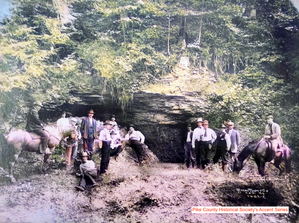 Near the Mouth of Little Elkhorn Creek, less than 40 feet above the creek. An open at Devil John W Wright’s coal bank, a coal sample was taken by J.J. Hillsman. Men shown in image listed from left to right: Horase Fox, James (Jim) Fox, John CC Mayo, J.J. Hillsman and young boy unknown.