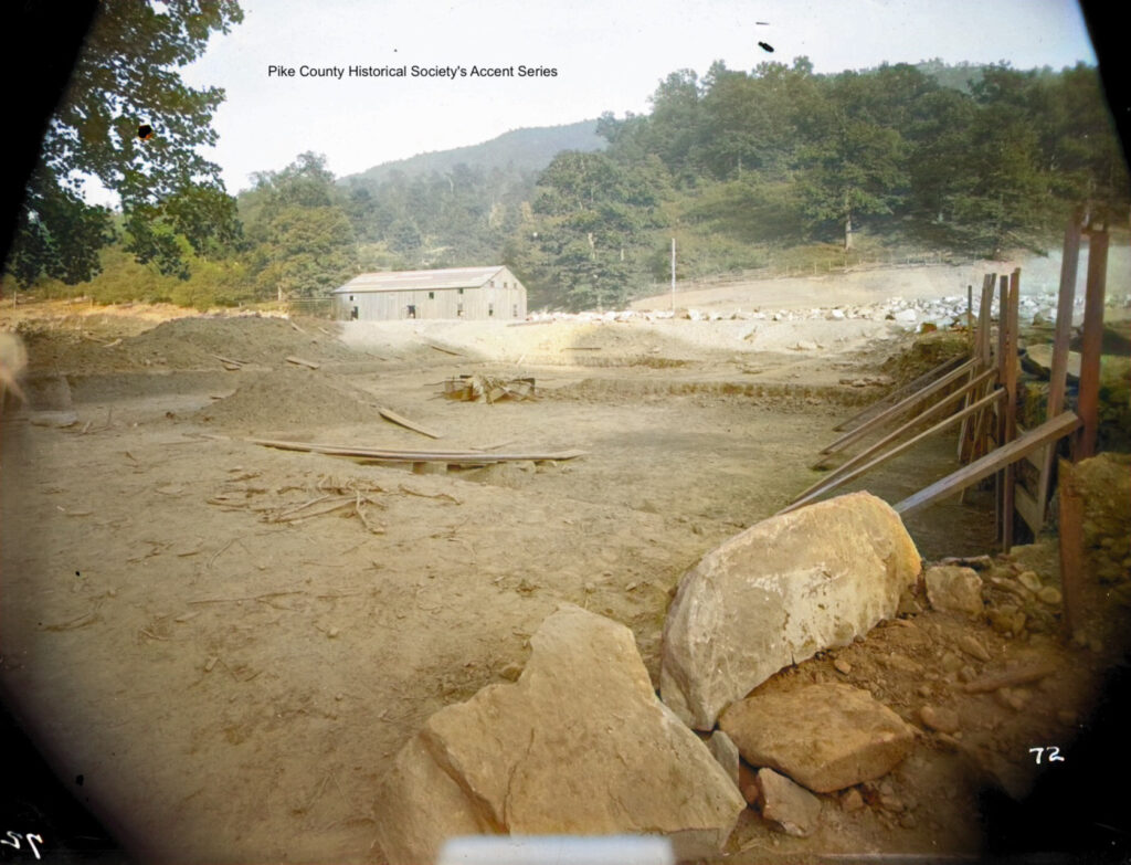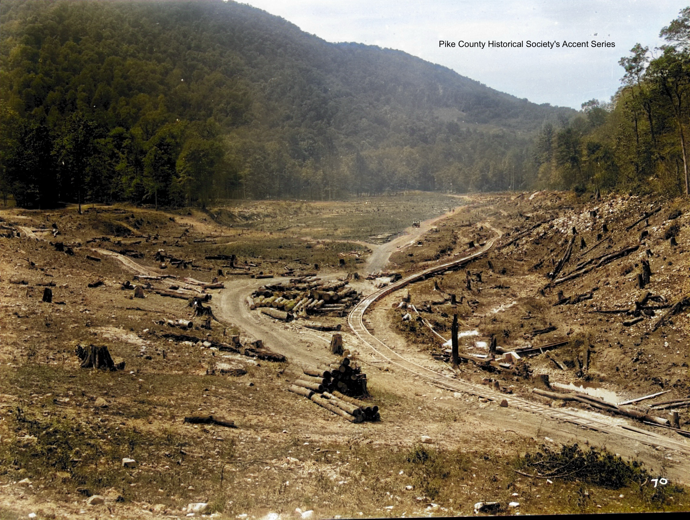 Little Elkhorn Creek basin looking towards the mouth. The future site for Elkhorn Lake is being cleared of trees and under brush. The Management at Pike County Historical Society apologize for the quality of image, but It does shown accurate timeline of construction.