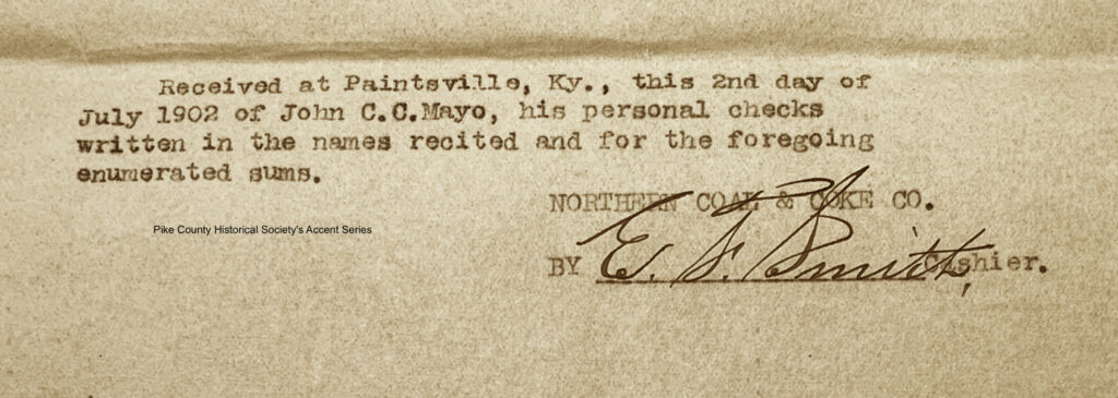 In the beginning of the century newspapers are the most popular source of who is selling and who’s buying in the virgin coal fields of Eastern Kentucky. In the summer 1901 the Ohio & Big Sandy Land Corporation, the business arm of Northern Coal and Coke with going around from farm to farm offering at that time more money than most Eastern Kentucky People had every seen in their lifetime. B.F. Johnson and G.B. Vaughn were going all over Shelby Creek, the head of Elkhorn Creek, Left Beaver and Rockhouse Creek, packing the personnel check book John CC Mayo. Usually BF Johnson a commissioned land agent for Mayo, would pay 10% down on a total agreed price, providing their land title checked out alright. The balance was normally paid out in 6 month according to Broad Form Deed Contract.